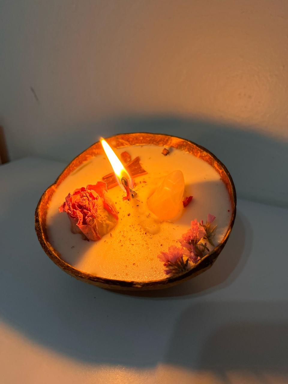 Aceite de coco, miel virgen, canela, clavo, piedra pirita.